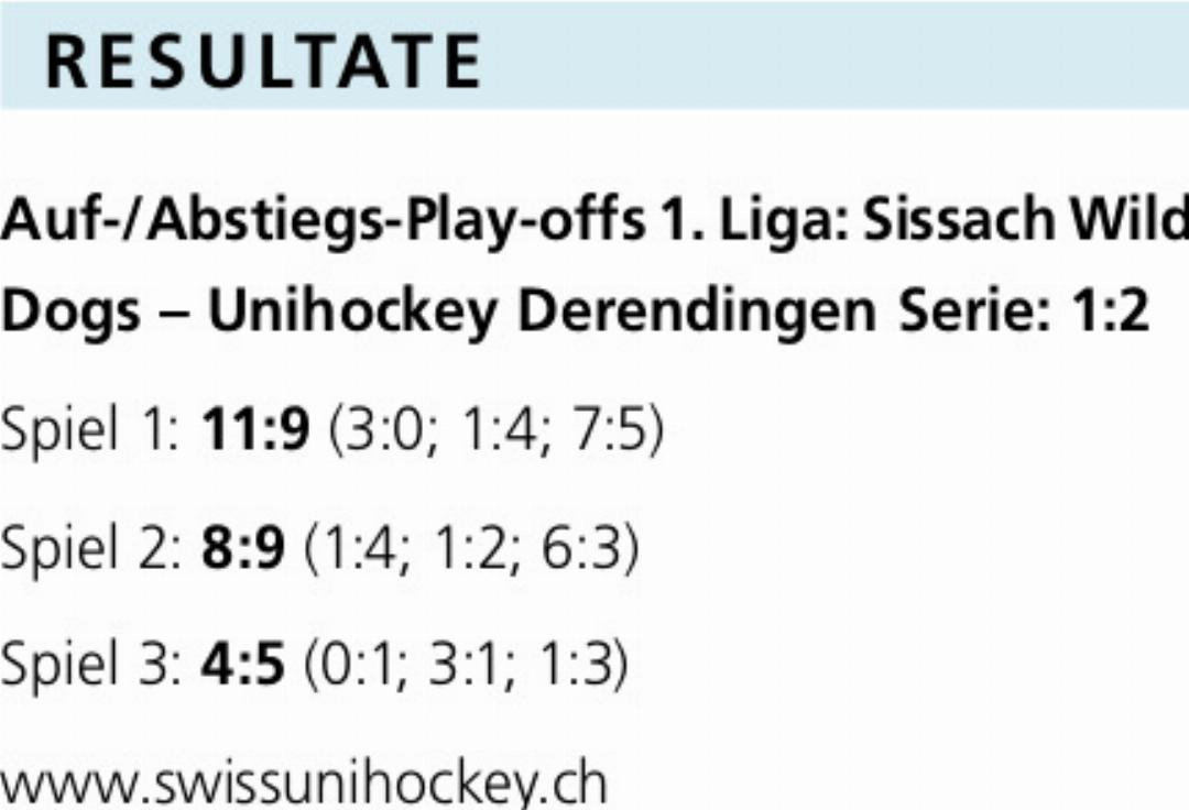 Die Unihockeyaner der Wild Dogs Sissach steigen aus der höchsten Kleinfeld-Liga der Schweiz ab. In einer engen Abstiegsserie gegen Derendingen gehen die letzten beiden Spiele jeweils mit einem Tor Vorsprung an die Solothurner.