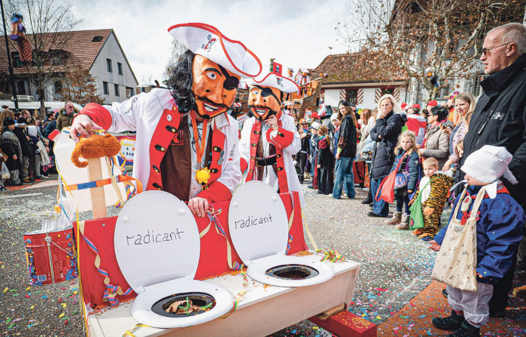 Vor den Wüehlmüüs ziehen wir unseren Dreispitz. Die Wagenclique segelte in einer ausgewachsenen Karavelle von Rickenbach nach Sissach. An Bord lauter geschniegelte Kantonalbank-Piraten in picobello rot-weissen Uniformen, die sie von A bis Z selber designt, genäht und bedruckt haben, wie die tapferen Schneiderinnen versicherten. Die wühlenden Wägeler legen im Übrigen Wert auf die Tatsache, dass sie nicht von der BLKB gesponsert worden sind. Die bräuchten ihr Geld grad für anderes. Ebenfalls die Millionen-Pleite hat das Team Lauch ausgespielt. Dieses beurteilen das Engagement der BLKB bei der Radicant-Digitalbank als einen feuchten Furz. Es versteht sich, dass sie der Meinung sind, die Bank hätte das Geld besser in Lauch investiert.