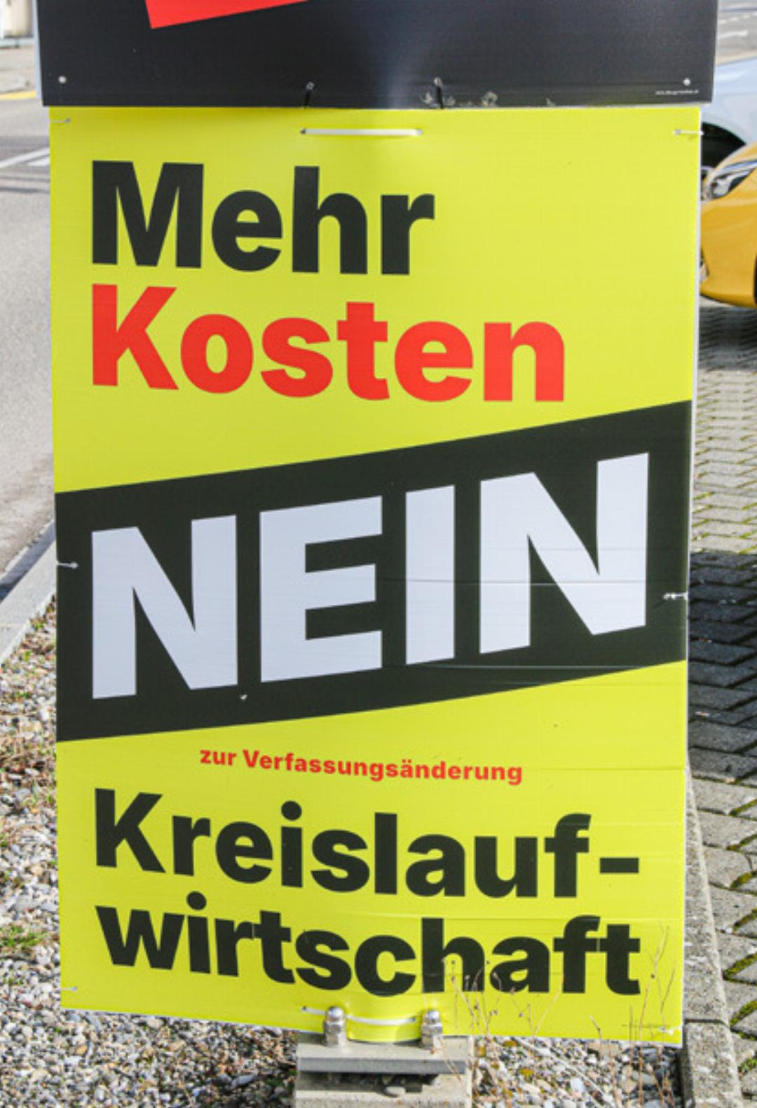Roberto D’Agostini steht vor einem Abstimmungsplakat beim Sissacher Bahnhof. Zuerst schweigt er einen Moment, dann versucht er, sich einen Reim aus dem Plakat zu machen. Schliesslich resigniert er: «Worum geht es hier genau?» Gewichtung und Botschaft seien unklar, sagt D’Agostini. Zudem fehle der Absender. Wir liefern die Auflösung: Hinter dem Plakat steht ein bürgerliches Komitee. Es wehrt sich gegen einen Artikel zur Stärkung der Kreislaufwirtschaft, der in die Kantonsverfassung aufgenommen werden soll.