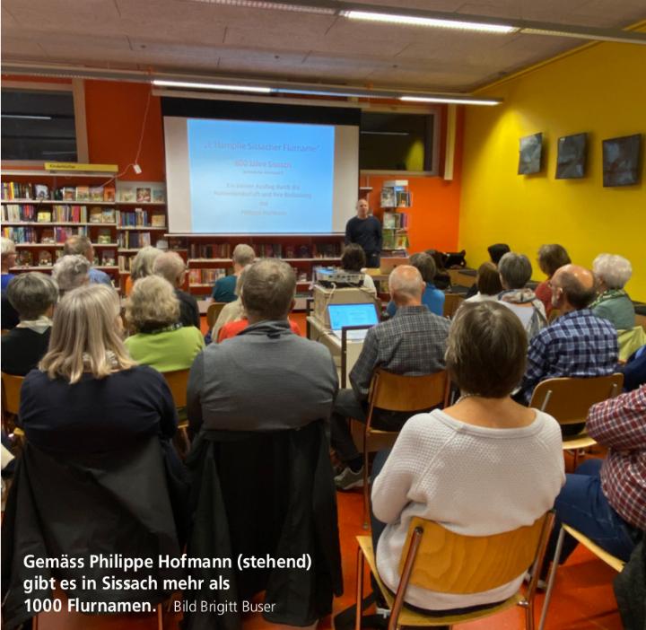 «In Sissach gibt es 1133 Flurnamen, wobei 274 Namen lebendig und daher noch im kollektiven Namenschatz vorhanden sind», sagt Philippe Hofmann, Namenforscher, Autor und Mitherausgeber der Baselbieter Namenkunde. Am vorletzten Anlass seiner Erlebniswoche hatte der Frauenverein zum Vortrag «E Hampfle Sissacher Flurnäme, 800 Jahre Sissach» in die Bibliothek Sissach eingeladen. Dabei wurden den zahlreichen Besuchern Einblicke in die Forschung, Entstehung und Bedeutung der Sissacher Flurnamen im Laufe der 800-jährigen Geschichte des Dorfes gewährt. Doch vorab wies Hofmann darauf hin, dass er dem Haupttitel des Vortrags den Untertitel «Stimmt das überhaupt?» zugefügt habe. Damit gemeint war, dass Sissach 800 Jahre alt ist. Bis zur Antwort mussten sich die Anwesenden etwas gedulden. Hofmann sagte, dass er nochmals darauf zurückkommen werde. Zuerst ging es jedoch an die vielschichtige Namenlandschaft von Sissach.
