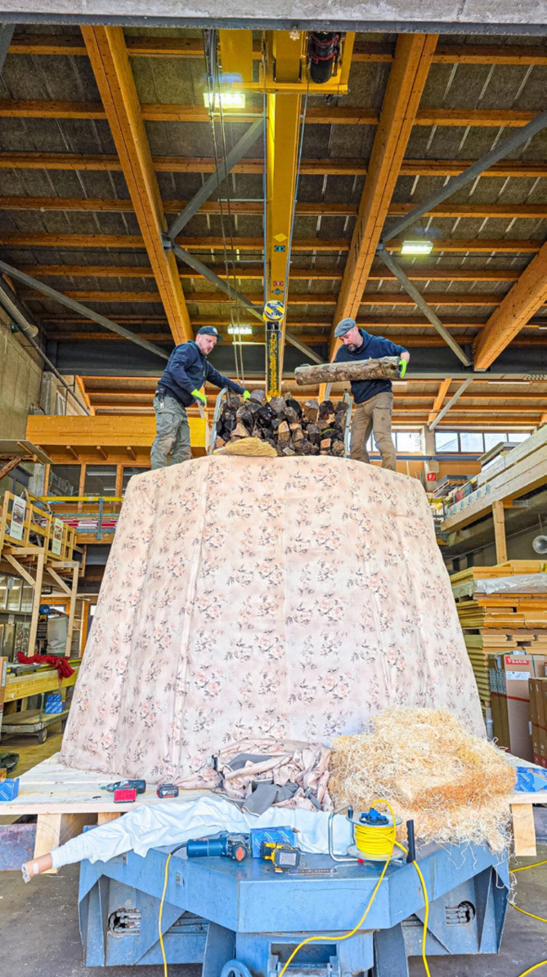 Das 7,5 Meter hohe und mehrere Tonnen schwere «Chluuri» wurde wie jedes Jahr mit vier bis fünf Ster Brennholz gefüllt. Der Bau sei diesmal vergleichsweise einfach gewesen, erzählen die «Chluuribouer»: «In anderen Jahren haben wir noch Treppchen oder Häuschen dazu gebaut – das war deutlich aufwendiger.» Eine Herausforderung seien hingegen stets die Hände: «Eine Hand ist eigentlich so gross wie ein Gesicht. Dass das bei einem ‹Chluuri› nicht passt, ist selbsterklärend. Deshalb ist es immer schwierig, passende Proportionen zu finden.»