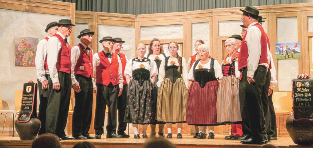 «Früeh am Morge uf de Bärge, schöner chas wohl niene sy. Tüemer jodle, jutze, singe, scho bim erste Sunneschyn»: Mit diesem Jodellied, komponiert von J. Clémençon, präsentierte sich der Gastgeber ein erstes Mal. Die Jodlerinnen und ihre bodenständigen Kollegen vermittelten Gefühle von Freude und optimistischer Begeisterung. Während der Liedvorträge war es mäuschenstill in der gut besuchten Turnhalle. Das zeugt von einem sehr sachverständigen Publikum. Allen Liedvorträgen wurde herzlicher Applaus geschenkt. Im zweiten Teil des Abends spielte die Theatergruppe des Jodlerklubs den Schwank in einem Akt von Fritz Klein «Voll denäbe». Nach einer durchzechten Nacht hat es dem Verkäufer Ruedi die Sprache verschlagen. Wie soll er seiner Frau auch noch erklären, dass er seine Brieftasche verloren hat? Sein Freund Kurt hilft ihm aus der Patsche. Mit Ausreden, dass Ruedi Opfer eines Überfalls wurde, geriet die ganze Sache aus dem Ruder und endete «Voll denäbe». Herrlich locker und amüsant gespielt.