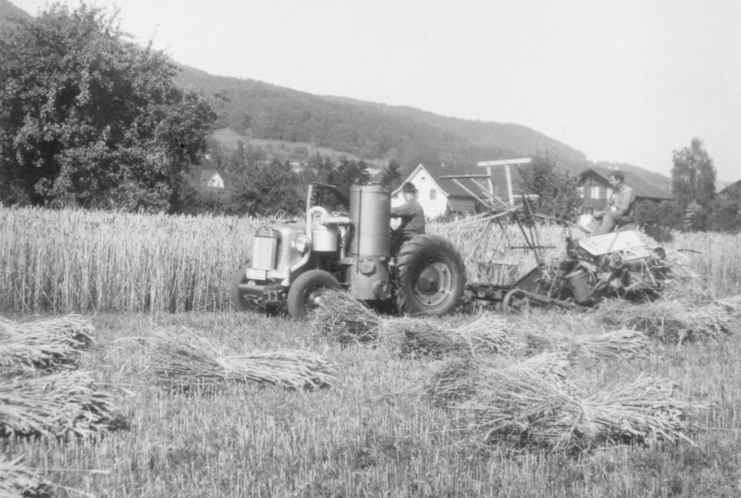 07.11.2025 RÜCKSPIEGELIn der Zeit des Zweiten Weltkriegs wurden Holzvergaser anstelle von flüssigem Brennstoff eingesetzt. Hier ein Traktor von Landwirt Blapp beim Ernten mit einem Garbenbinder, aufgenommen um 1945 auf dem Feld hinter der katholischen Kirche Sissach. Archiv Heinz Spinnler