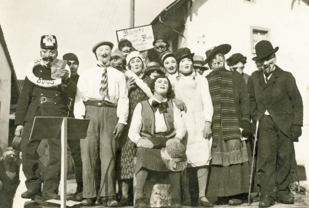 20.02.2026 RÜCKSPIEGELDas Bild entstand um 1930. Das Motto der Fasnacht war: «Aufgebot! für Schwimmer in Buus, Schwimmkurs Dorfplatz».