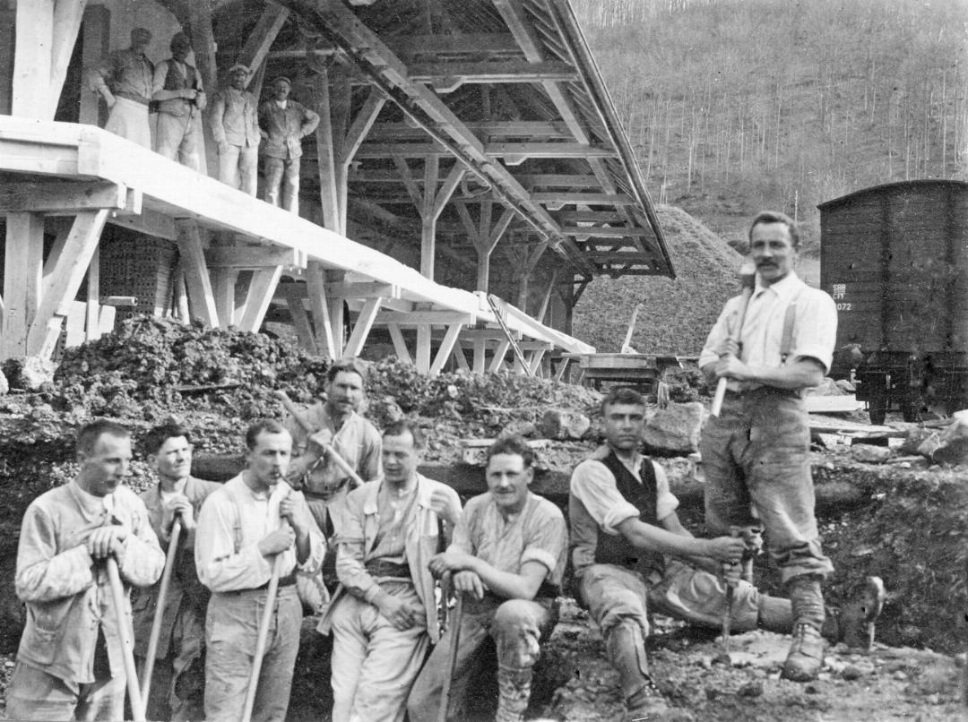 Hier wird die Verladerampe der Gips-Union gebaut. Sie ermöglichte den Verlad der schweren Güter auf die Bahnwaggons.