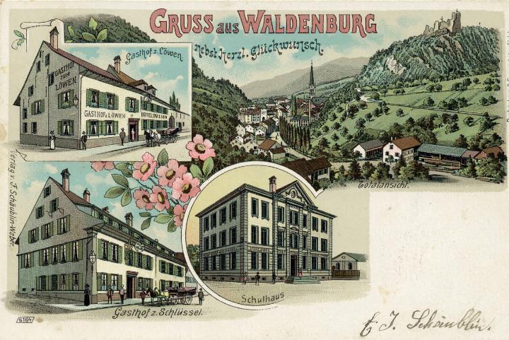 Lithografie von Waldenburg – hier eine Kartenvariante mit einem Zudruck für einen Glückwunsch.