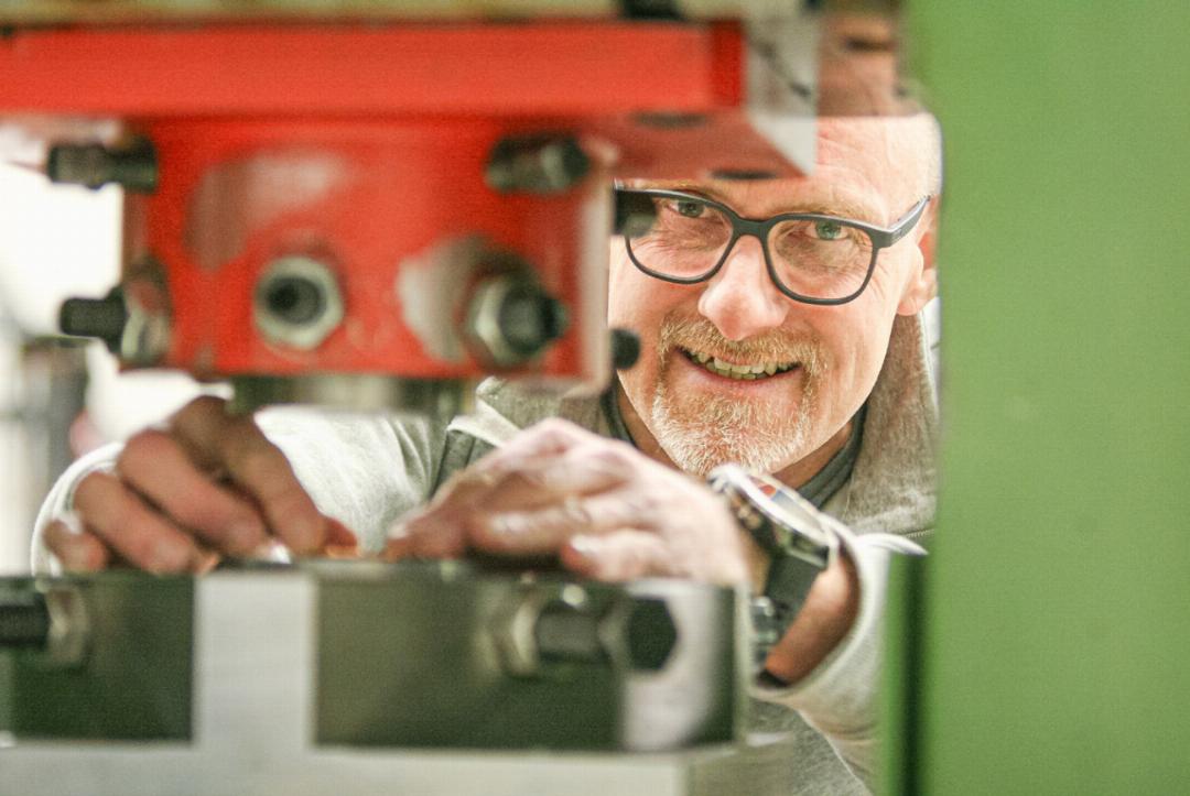 Thomas Liechti, Inhaber der Firma Prägetech, nutzt die Ausgabe der Gelterkinder Plakette, um sein Reich zu präsentieren. Von Maschine zu Maschine nimmt er die Neugierigen mit. Einige der Gäste halten ein vorgezogenes Apéro-Bierchen in der Hand. Macht das Staunen gemütlicher.