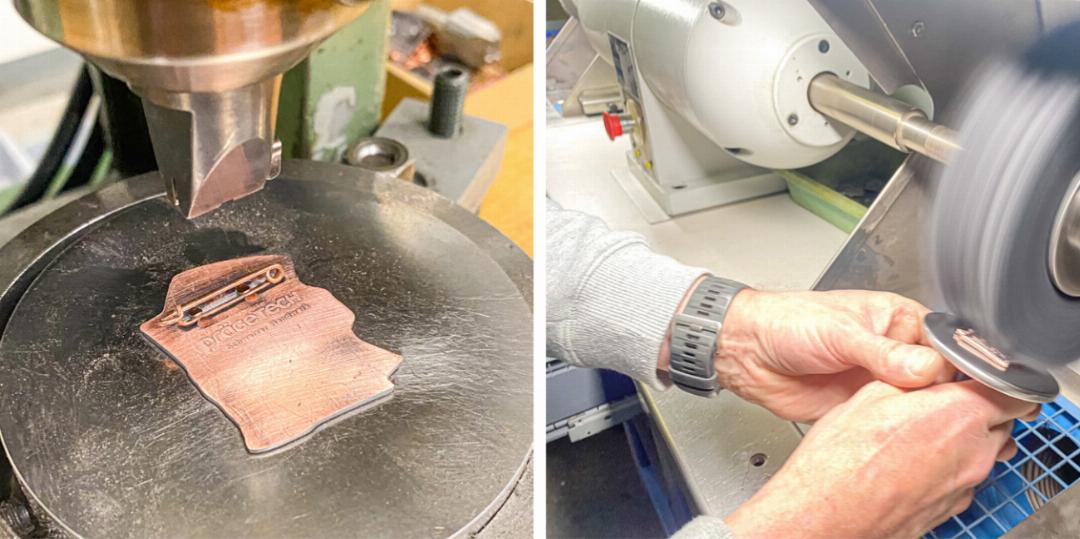 Wer in dieser Industriehalle arbeitet, sollte dies sorgfältig tun. Vor allem sollte er oder sie auf die eigenen Finger achten, schliesslich entfaltet die Stanzmaschine einen Stanzdruck von 40 Tonnen, die Prägemaschine sogar einen Pressdruck von 350 Tonnen. Was die Finger deformieren würde, bringt die Plaketten erst so richtig in Form.