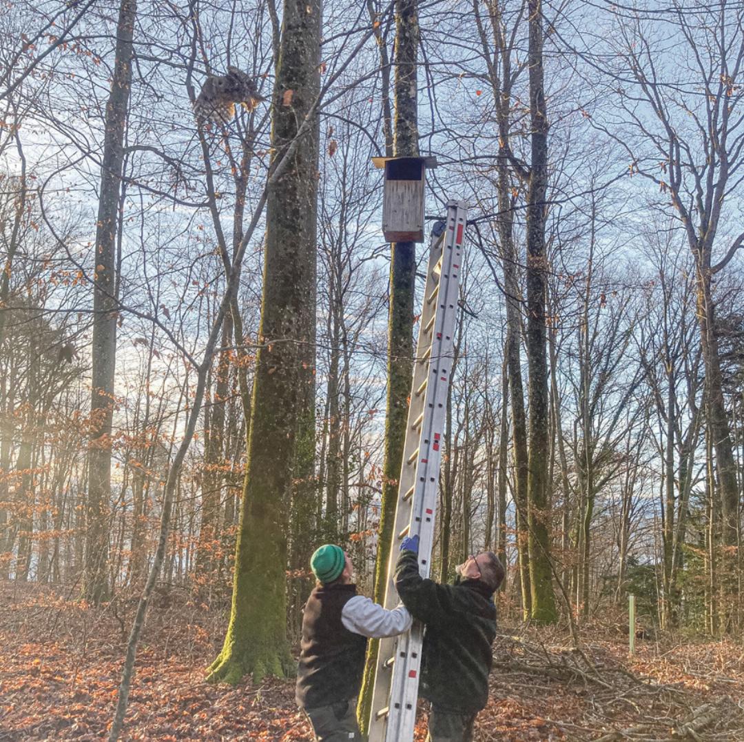 Ein erster Höhepunkt des Tages war uns dann schon bei der zweiten Station beschert. Ein Waldkauz war «not amused», dass wir uns an seiner Behausung zu schaffen machten. Beim Anstellen der Leiter zog er es vor, sich zu entfernen, und schwebte majestätisch durch den Wald davon. Ein schönes und eindrückliches Erlebnis.