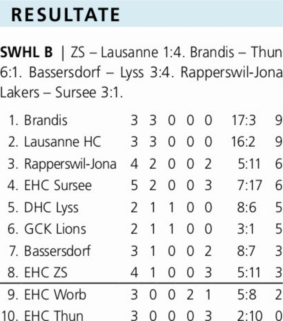 Bei Lausanne vermochten die zweifachen Torschützinnen Lena Esteve und Alixane Berthod sowie die Torhüterin Aurélie Roehrich besondere Akzente zu setzen. Für Zunzgen-Sissach war es trotz wackerem, unermüdlichem Einsatz insgesamt ein gebrauchter Abend. Chance auf Besserung bietet sich am Sonntag auswärts gegen den EHC Sursee, der bisher zwei seiner fünf Partien gewinnen konnte.