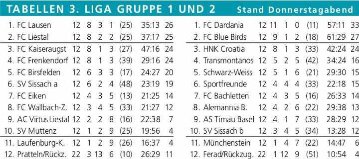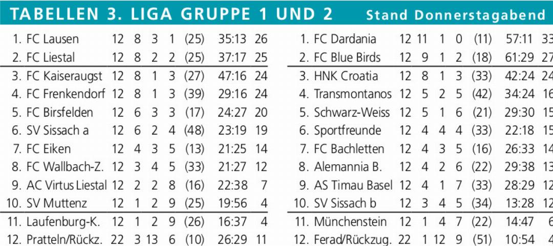 Die gemütlichste Situation hat der FC Lausen: Der FCL überwinterte auf dem Tabellenthron und befindet sich somit auf einem Aufstiegsplatz. Gemäss Reglement dürfen jeweils die zwei besten Teams der drei 4.-Liga-Gruppen aufsteigen (sofern nicht zwei oder mehr FVNWS-Teams aus der 2. Liga interregional absteigen).