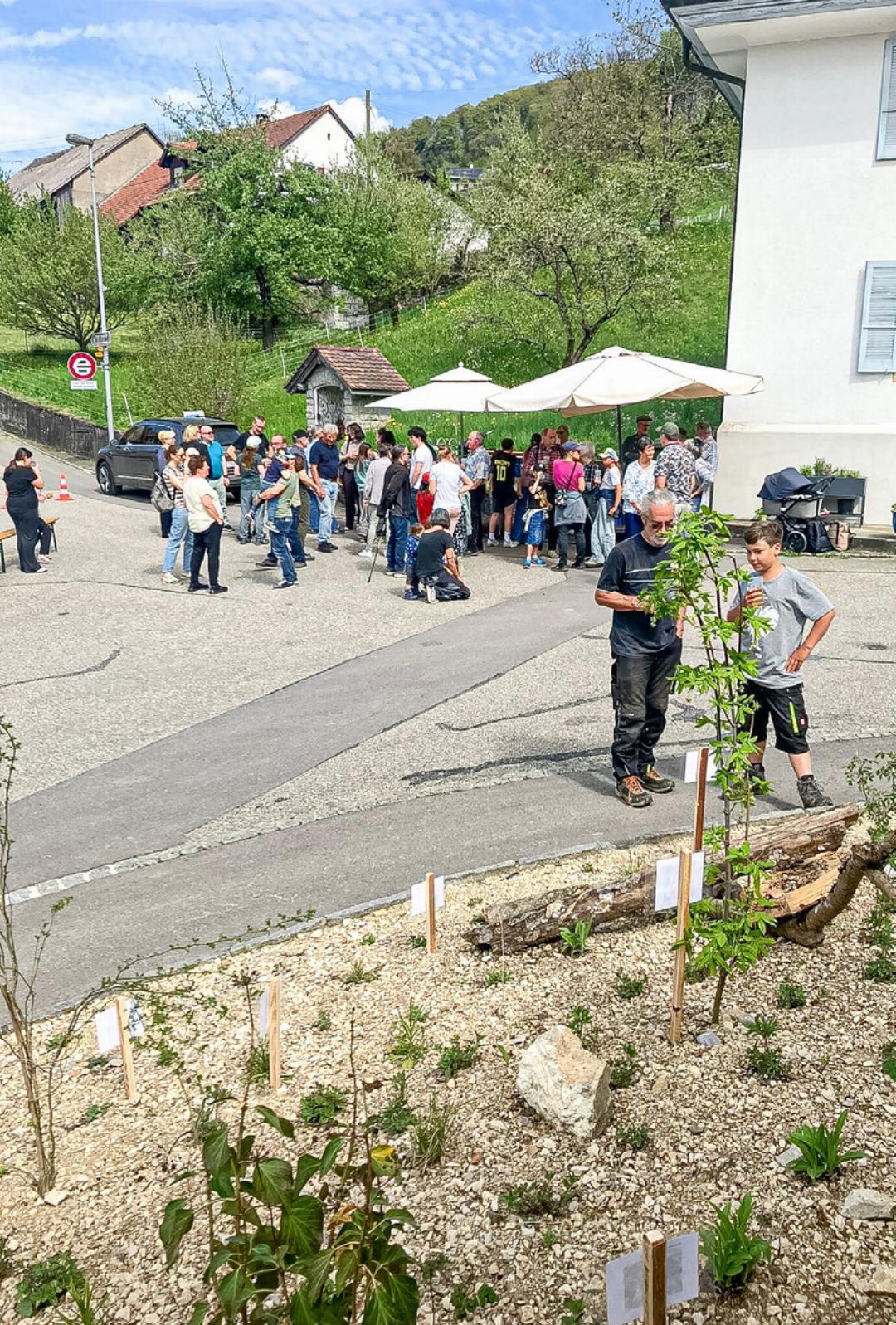 Am Samstag wurden die neu gestalteten Rabatten der Grundstückeignerin, der katholischen Kirchgemeinde, vertreten durch deren Präsidenten Sven Kottmann, quasi zurückgegeben. Am entsprechenden Festakt nahmen neben zahlreichen Besucherinnen und Besuchern Gemeindepräsidentin Adriana Marti-Gubler, die Vertreterin des Juraparks Aargau, Anja Trachsel, der Vereinsspitze von «Kienberg+» und Schulleiter Dominik Rohr teil, der ein von den Schülerinnen und Schülern gefertigtes Bienenhotel übergab.