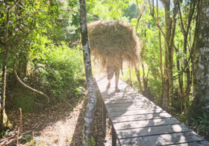 Zugegeben, es klingt romantischer als es war. Es war Arbeit, anstrengende Arbeit, manchmal bis zum Eindunkeln. Auch das Heupressen ist nicht ohne. Den Job hat Johnny gefasst, denn er ist der einzige mit den notwendigen Muckis. Dennoch: Der Unterschied zum maschinellen Heuen ist riesig. Die sinnliche Wahrnehmung macht’s aus. Das Berühren, Riechen, Sehen und Hören bringt uns in eine enge Beziehung zu dem, was wir tun. Das macht Arbeit, auch harte Arbeit, erfüllend.