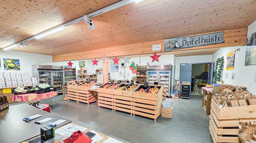 Heute sind dort Obst, Beeren sowie Spezialitäten wie Aprikosen und Feigen aus eigenem Anbau erhältlich. Hinzu kommen selbst verarbeitete Produkte sowie zugekaufte Waren von regionalen Produzenten: Süssmost, Konfitüren, Sirupe, Trockenfrüchte, Honig, Eier, Teigwaren, Fleisch, Milchprodukte, Gemüse, Kartoffeln und Backwaren. Ergänzend zum Hofladen entstanden Räume für die Verarbeitung der Produkte und für die Langzeitlagerung von Äpfeln.