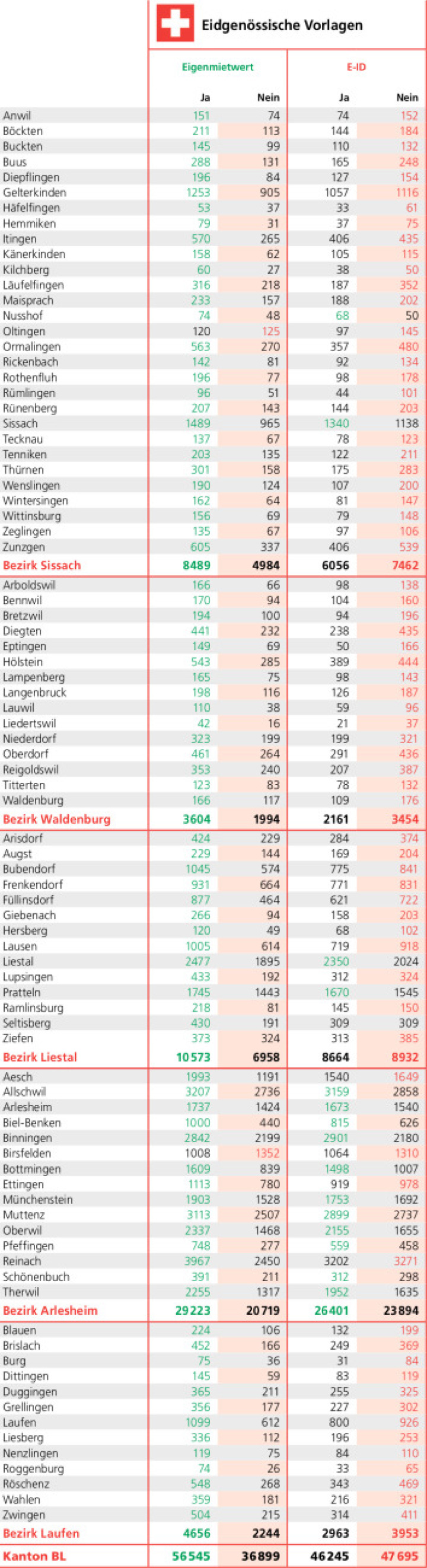 Mit 60,5 Prozent Ja-Stimmen haben sich die Baselbieterinnen und Baselbieter für die Abschaffung der Besteuerung von Wohneigentum ausgesprochen. Mit Ausnahme von Birsfelden (57,3 Prozent Nein) und Oltingen (51 Prozent) haben alle Baselbieter Gemeinden sowie auch alle fünf Bezirke die Vorlage angenommen. Am deutlichsten ist die Zustimmung im Bezirk Laufen (67,5 Prozent), gefolgt von Waldenburg (64,4 Prozent) und Sissach (63 Prozent). Die tiefste Rate weist der Bezirk Arlesheim mit 58,5 Prozent auf. Liestal schliesslich liegt bei 60,3 Prozent Ja-Stimmen.