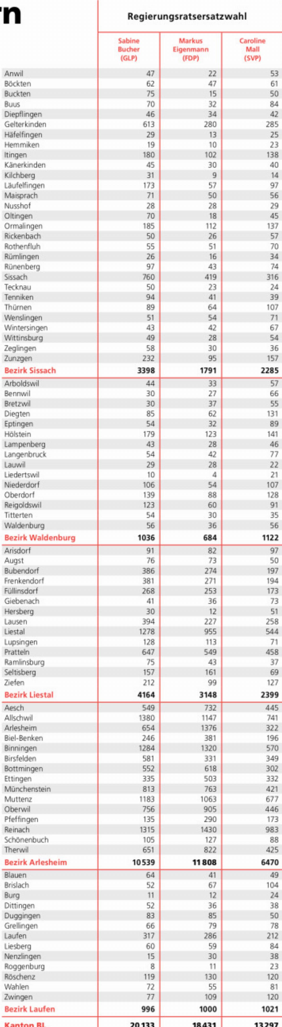 Mall verzeichnete im Bezirk Sissach in kleineren Dörfern ebenfalls starke Resultate: In elf Gemeinden holte sie den Spitzenplatz und schöpfte fast das ganze Potenzial der SVP aus. Eigenmann erreichte zwar nirgends den Spitzenplatz, sammelte jedoch rund 2 Prozentpunkte mehr Stimmen als sein Wählerpotenzial. Alle drei Kandidierenden konnten gut mobilisieren, und trotzdem war die Wahlbeteiligung im Bezirk Sissach tief. Ein ähnliches Bild lässt sich auch im Bezirk Laufen zeichnen. Auch hier mobilisierte Bucher ihr Wählerpotenzial, Eigenmann blieb rund 7 Prozentpunkte darunter, was Mall mit rund 8 Punkten über dem SVP-Anteil ausglich – und dennoch war auch in Laufen die Wahlbeteiligung tief.
