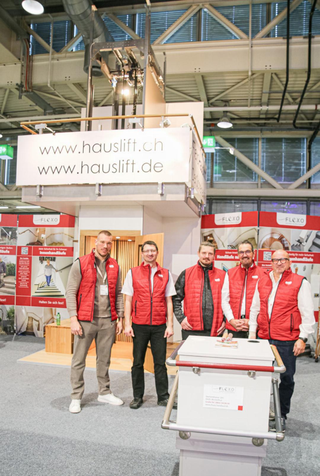 Am Stand fällt sofort ein einstöckiger Hauslift auf, daneben stehen Rollstühle und Rollatoren, um den Lift aus der Sicht von Mobilitätseingeschränkten zu testen. «Dieser Hauslift wurde in den vergangenen vier Jahren entwickelt», erklärt Müller. «Er lässt sich über ein Stockwerk in jedes bestehende Einfamilienhaus einbauen und ermöglicht es älteren oder eingeschränkten Menschen, lange zu Hause zu bleiben – ohne vom Rollstuhl auf den klassischen Treppenlift umsteigen zu müssen.»
