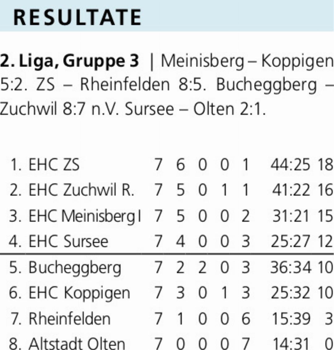 EHC Zunzgen-Sissach – EHC Rheinfelden 8:5 (3:1; 3:0; 2:4). Eisbahn: Sissach. Zuschauer: 300. Schiedsrichter: Bläser, Horisberger. Tore: 2. Gysi (Model) 1:0; 3. Spreyermann (Gyger, Niederhauser) 2:0; 10. R. Flückiger (Gafner, P. Lenz/Ausschluss Imhof) 2:1; 16. Bertschy (Arm, Imhof) 3:1; 25. Gyger (Seiler, Hunziker) 4:1; 29. Gusset (Dietrich/Ausschluss De Simone) 5:1; 32. Di Biase (Model, Hunziker/Ausschlüsse M. Lenz, Mäder) 6:1; 45. Mäder 6:2; 49. Lanz (Di Biase/Ausschluss Scerbakovs) 7:2; 51. De Simone (Mäder) 7:3; 53. Scerbakovs (Gafner) 7:4; 55. M. Lenz (Odrich, Wirz/Ausschluss Seiler) 7:5; 59. Imhof (Gusset, Dietrich/Ausschluss D. Flückiger) 8:5.