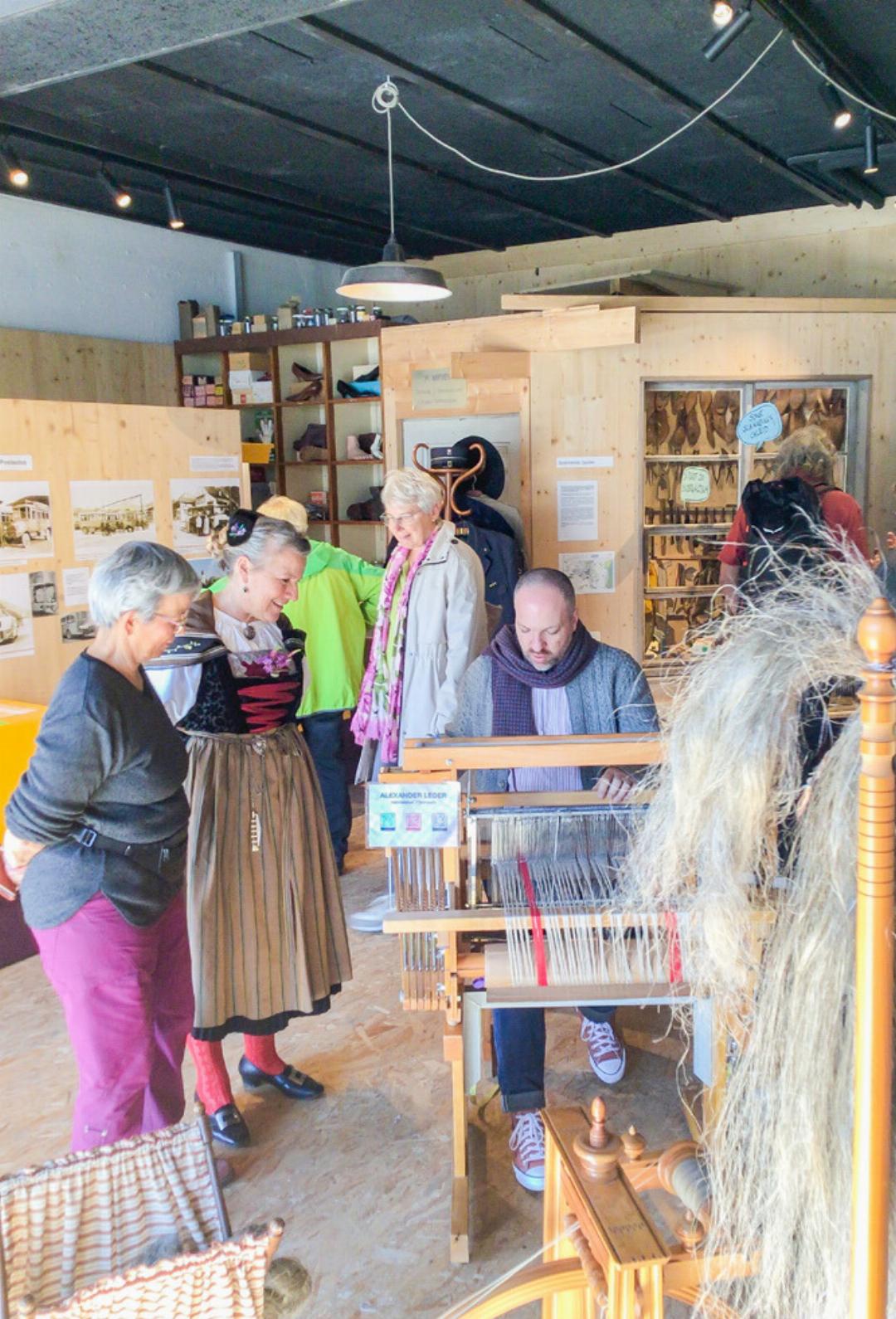 Direkt beim Dorfplatz konnten sich die Besuchenden in alte Zeiten zurückversetzen lassen. In der alten Dorfschmitte präsentierte ein Schmied sein Handwerk und im Dorfmuseum des VVM Maisprach wurde aus dem Maispracher Flachs vor Ort Tuch gewoben. Zudem zeigten zwei Frauen an ihren Spinnrädern, wie die speziellen Flachsfasern zu einem Faden gesponnen werden. Ausserdem bestand im Museum die Gelegenheit, sich über die Entstehung und Geschichte der Postautolinie 100 zu informieren. So zum Beispiel auch über den Zeitpunkt, als das Postauto die Postkutsche ablöste.
