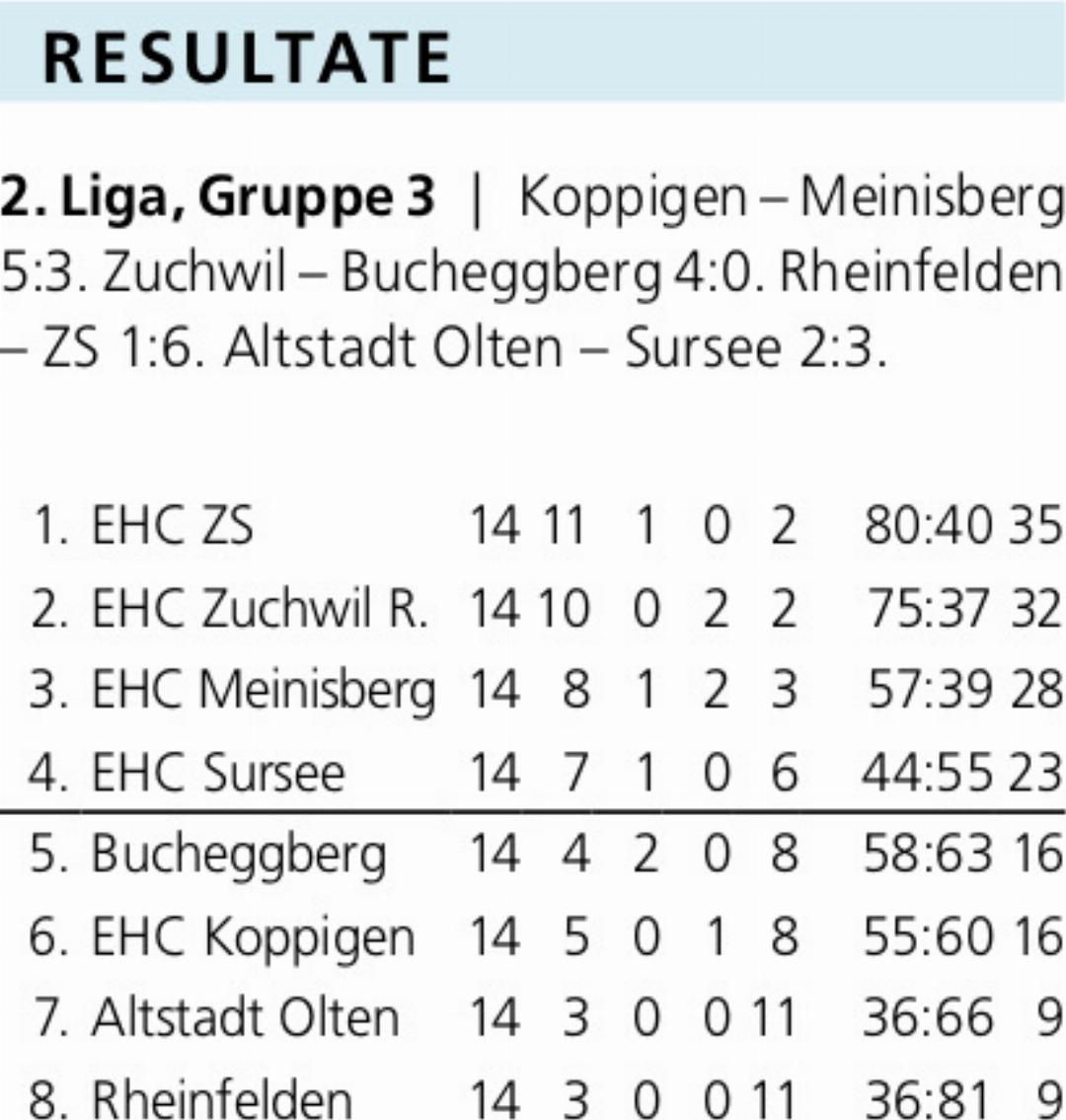 EHC Rheinfelden – EHC Zunzgen-Sissach 1:6 (0:2; 1;0; 0;4). Eisbahn: Rheinfelden. Zuschauer: 85. Schiedsrichter: Evalet, Salzmann.
