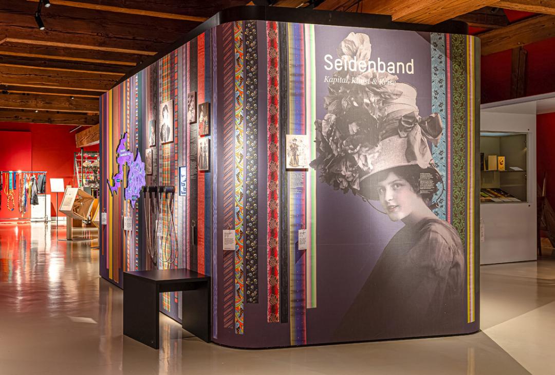 Ein weiteres neues Element der Dauerausstellung ist eine Koje, in der die Entwicklung des Sammlungsschwerpunkts Bandweberei und der Präsentation der wachsenden Sammlung entlang eines «Zeitstrahls» dargestellt werden. Seit mehr als 50 Jahren sammelt das Museum.BL Wissen zu dem für die Geschichte des Kantons Baselland zentralen Thema.