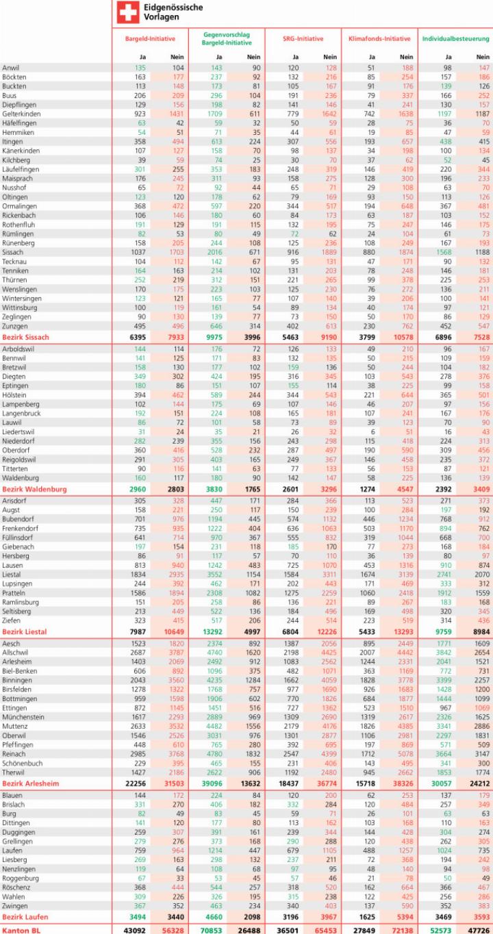 Vom Tisch ist auch die SRG-Gebührenhalbierung. Volk und Stände verwarfen die Idee, die Radio- und TV-Gebühren auf 200 Franken pro Jahr zu senken und juristische Personen vollständig von den Abgaben zu befreien, mit knapp 62 Prozent deutlich. Im Baselbiet stimmten nur zehn Gemeinden für die Vorlage – sechs davon aus dem Laufental. Spitzenreiter im Nein-Lager war erneut Seltisberg mit rund 73 Prozent. Nach dem Nein darf die SRG zwar aufatmen. Weil der Bundesrat im vergangenen Jahr beschlossen hat, die Haushaltsabgabe auf dem Verordnungsweg auf 300 Franken pro Jahr zu senken, muss sie trotzdem über die Bücher. Bis 2029 rechnet sie mit Einsparungen von rund 270 Millionen Franken. Die SRG geht deshalb von einem Abbau von 900 Vollzeitstellen über alle Regionen hinweg aus.