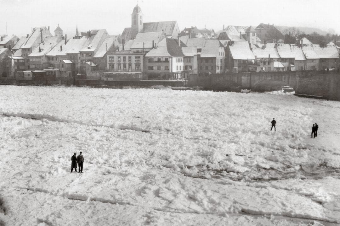Beeindruckend, wie sich das Eis vor der Rheinbrücke in Rheinfelden auftürmt, dies Mitte Februar 1929.
