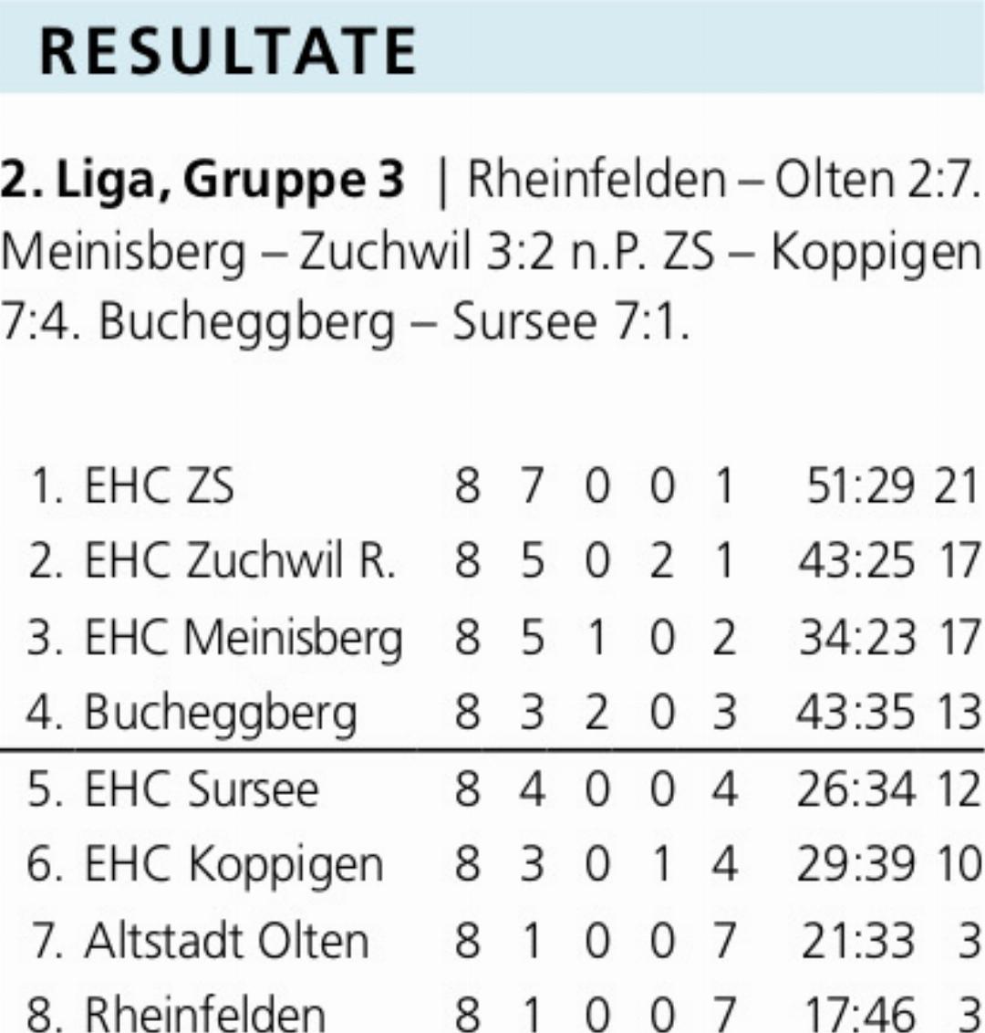 EHC Zunzgen-Sissach – EHC Koppigen 7:4 (3:2; 1:1; 3:1). Eisbahn: Sissach. Zuschauer: 231. Schiedsrichter: Matthey, Prieto. Tore: 6. Niederhauser (Imhof) 1:0; 8. Salzmann (Bernasconi, Kilchenmann/Ausschluss Di Biase) 1:1; 9. Di Biase (Arm); 2:1. 12. Hunziker (Seiler) 3:1; 14. Zingg (Wagner, Haider) 3:2; 31. Mocci 3:3; 40. Niederhauser (Gysi) 4:3; 44. Gyger (Seiler, Hunziker) 5:3; 50. Di Biase (D. Müller, Hunziker/Auschluss Heiniger) 6:3; 57. J. Lanz (Gyger/Ausschluss Heiniger) 7:3; 60. Haider (Salzmann) 7:4. Strafen: 3-mal 2 Minuten gegen ZS, 4-mal 2 Minuten gegen Koppigen.