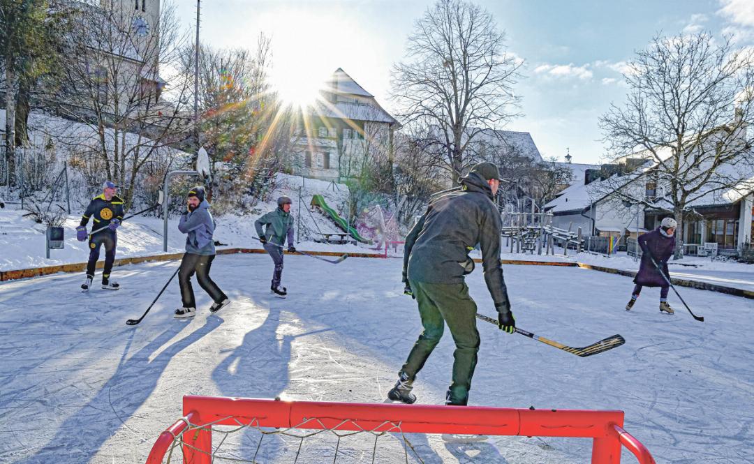 Damit sich Eishockeyspieler und Schlittschuhläuferinnen und -läufer nicht in die Quere kommen, ist von Anfang an ein langer Trennbalken aus Holz in der Mitte der rund 30 mal 40 Meter grossen Eisfläche platziert worden. Im hinteren Teil wird Hockey gespielt, im vorderen Teil drehen alle anderen ihre mehr oder weniger eleganten Runden.