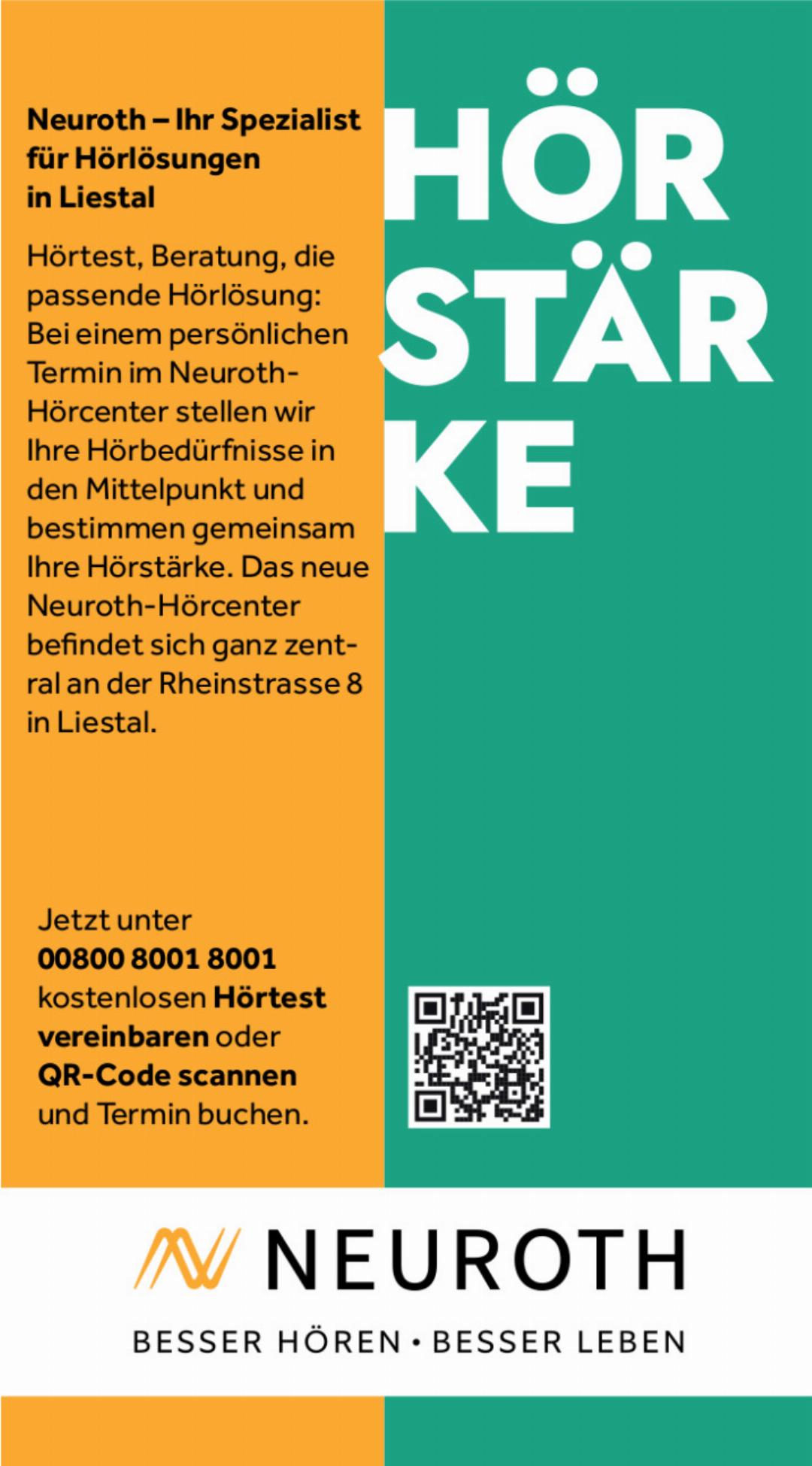 Das Neuroth-Hörcenter Liestal ist umgezogen und befi ndet sich unweit des bisher gewohnten Standortes neu an der Rheinstrasse 8, direkt beim Tertianum Rebgarten. Das neue Neuroth-Hörcenter ist grösser, moderner und sehr zentral gelegen. Im Neuroth-Team in Liestal beraten und begleiten Hörcenterleiterin und Hörakustikmeisterin Anke Laugwitz, Hörberaterin Raf aela Müller und Fiona Wenger, Lernende Hörsystemakustikerin, die Kundinnen und Kunden in allen Fragen des Hörens. «Wir sorgen für mehr Hörstärke und schenken Lebensqualität.»