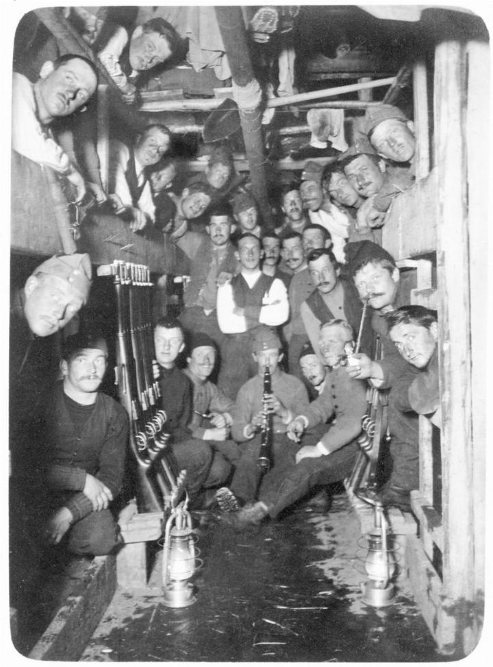 Dieses Bild zeigt eine Militärunterkunft während des Ersten Weltkriegs, 1917, in der Fortifikation Hauenstein, auf dem Spitzenflüeli (Bölchenregion). Archiv Heinz Spinnler