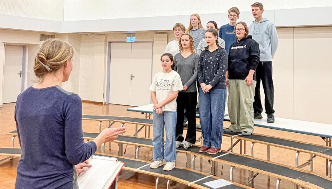 Viertel vor acht, die Jugendlichen kommen pünktlich zur Probe. Die Bühne wird zusammen aufgebaut und dann geht es zur Sache, seriös und dennoch beschwingt. Vera Weber leitet gekonnt, singt mit ihrem hellen Sopran mit, begleitet am Klavier, gibt den Takt an und ist in ihrem Element. Andi Grossmann bedient die Soundanlage, ist der Mentor im Hintergrund, überreicht das Mikrofon für ein Solo im Jugendchor oder übernimmt gleich selbst, wo eine Solostimme ausfällt. Er tut dies fokussiert und gelassen, ist das eingespielte Pendant zu Weber.