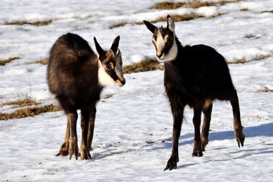 Diese beiden Gämskitze, die 8 und 9 Monate alt sind, suchen im Berner Jura schneefreie Stellen, um etwas Essbares zu finden, beobachtet von Bruno Schaub.
