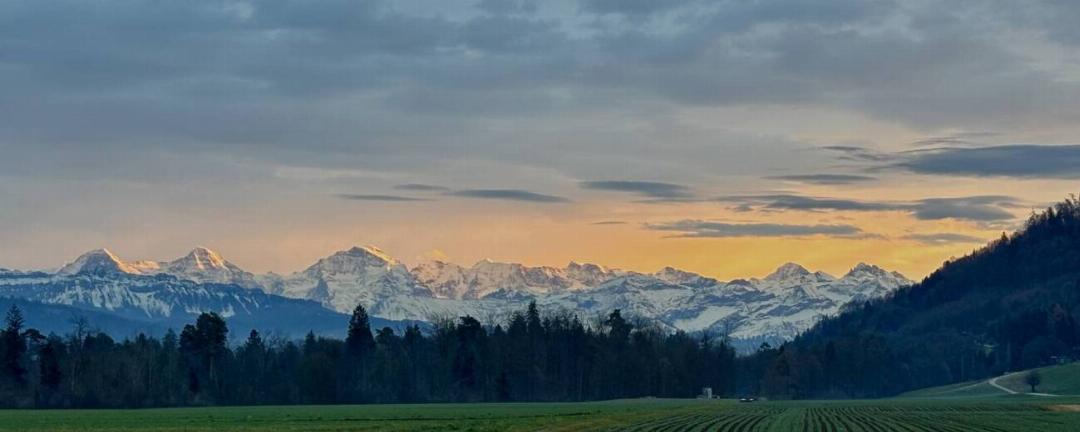 Im warmen Abendrot zeigt sich von Belp aus ein beeindruckendes Alpenpanorama mit Eiger, Mönch und Jungfrau – festgehalten von Eugen Schwarz aus Oberdorf.