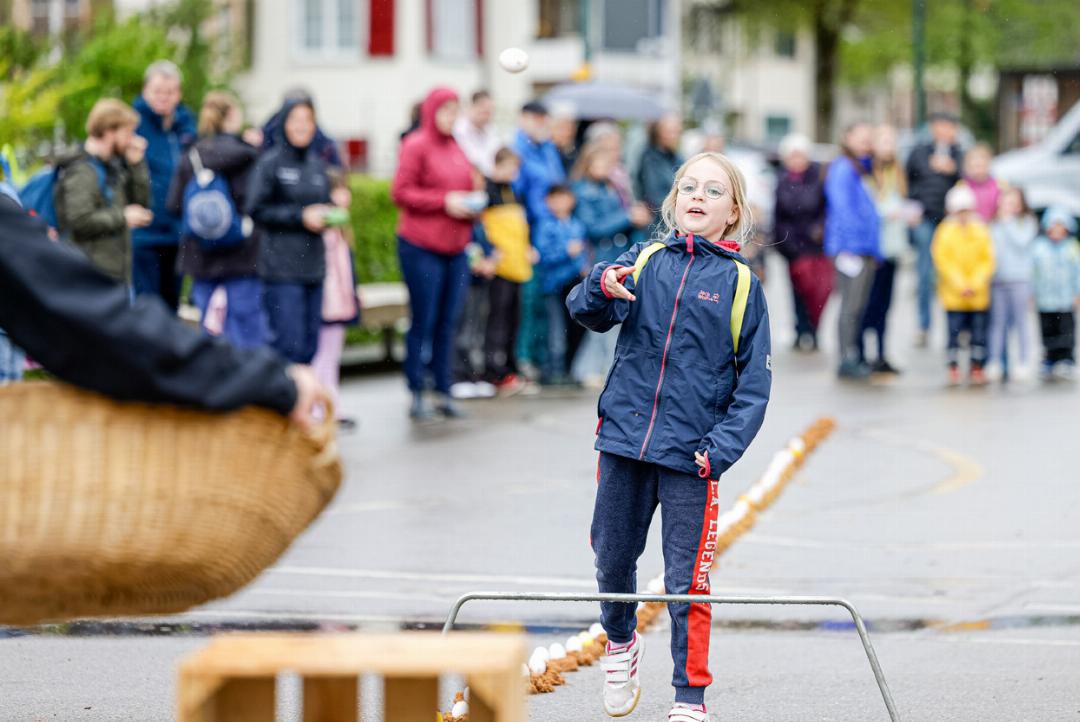 In der zweiten Runde, als die Kinder am Rennen waren, flog das eine oder andere Ei weit hinter den Fangkörben in die Zuschauermenge. Getroffen wurde aber niemand. Gewonnen haben beide Teams und so bekamen alle, die mitmachten, eine Glace, die auch bei kühlem Regenwetter rasch weggeschleckt war.