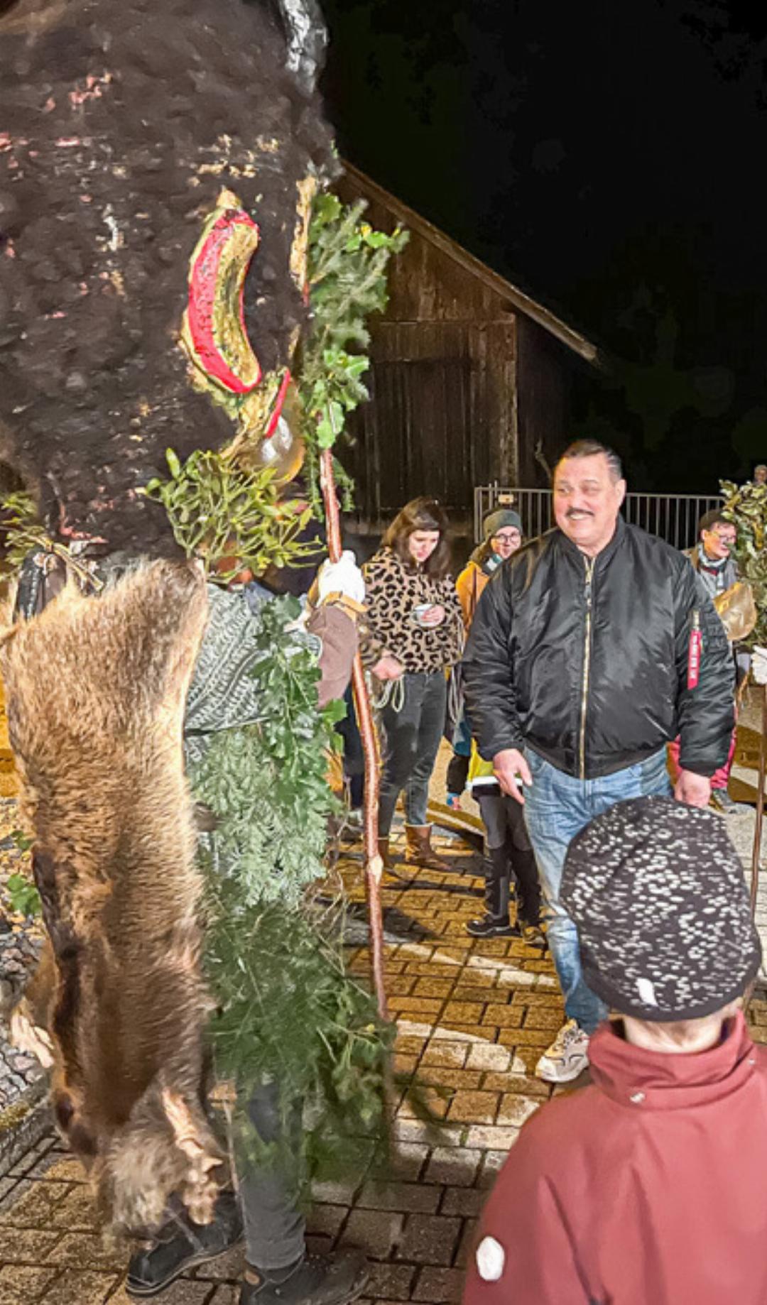 Die Ehre der Abwesenden musste jetzt Bernd Huber retten, der nächste Adressat auf der Route. Und das tat der kürzlich Eingebürgerte auf eindrückliche Art und Weise. Auf diversen aufgestellten Tischen standen Fleisch- und Käseplatten bereit, sehr zur Freude der vielen mitlaufenden Kinder und Jugendlichen, die schon «fast am Verhungern» waren. Eine grosse Auswahl an Getränken wurde ebenfalls offeriert und darüber hinaus schmückten mehrere Schweizerfahnen das Haus. Das Hutzgüri und sein Gefolge waren hocherfreut und machten sich zufrieden über das Dargebotene her. Schon bald hiess es hier und dort, dass dieser Mann einen sehr guten Gemeindepräsidenten abgeben würde.