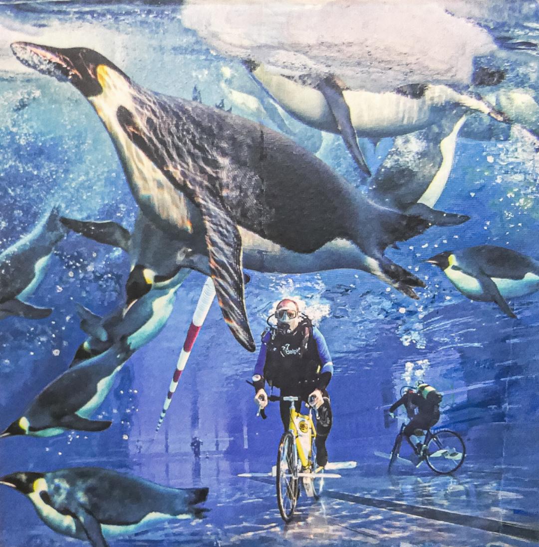 Ruth Honegger widmet sich seit bald 20 Jahren ihren Collagen auf Acryl. Für die Ausstellung hat sie 27 Werke geschaffen, die sich weitgehend mit dem Thema Velo befassen. «Meine Bilder sind stets gegenständlich, und ich arbeite mit einem Fundus aus Zeitschriften, aus denen ich Einzelteile mit einem Skalpell ausschneide und mit Acrylfarben zu einem Ganzen kombiniere.» Ihre Collagen entlocken den Besuchenden ein Schmunzeln, sei es der Velofahrende im Gemüsefeld oder der Rennfahrer unter Wasser umgeben von Pinguinen. Amüsant sind auch ihre Einmetertexte, die sie aus Wortfetzen aus Heften zusammengestellt hat und die sich Gedanken rund um den Drahtesel widmen.