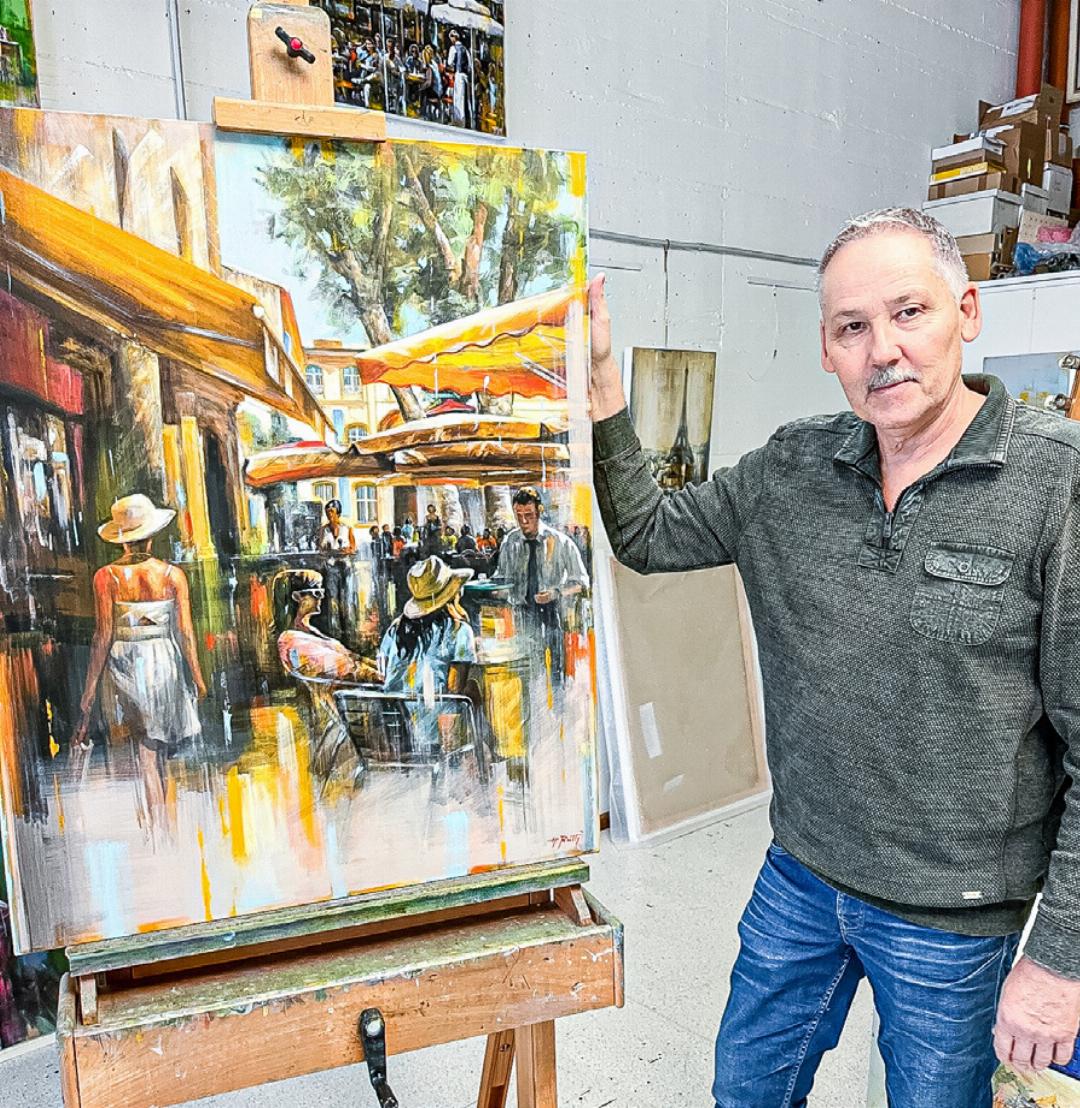 Seit Anfang 2025 hat Heinz Rütti wieder Zeit und Musse zum Malen von Bildern. Aktuell widmet er sich vorwiegend Kompositionen von halbabstrakten Bildern. Darauf zu sehen sind beispielsweise Landschaften und Gebäude, die alle in der Realität existieren. Bei der Ausarbeitung lässt er sich aber von Erinnerungen und Gefühlen leiten. Zu jedem Bild gibt es eine spannende Geschichte, die der Künstler auf Nachfrage gerne erzählt.