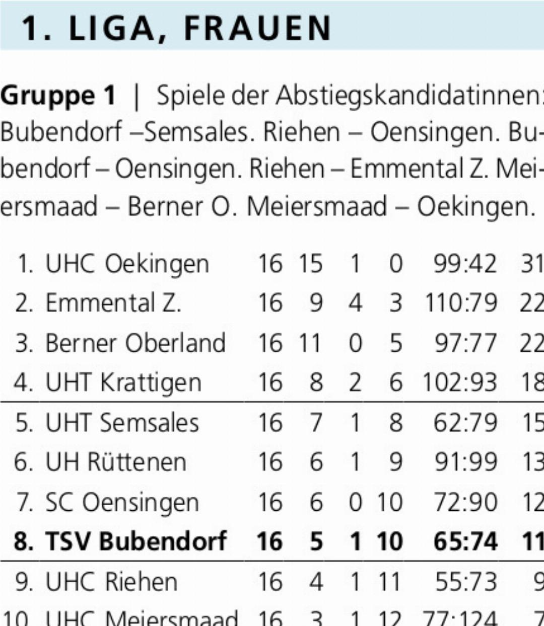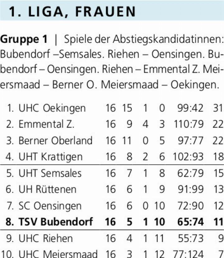 Zwei Spiele vor dem Ende der regulären Saison stehen die Erstligistinnen des TSV Bubendorf auf dem achten und somit drittletzten Tabellenplatz. Die Situation ist brisant: Die Teams auf Rang 9 und 10 müssen in die Abstiegsrunde. Der Abstand nach hinten beträgt nur zwei Punkte, der UHC Riehen könnte mit einem Sieg mehr aus den letzten beiden Partien also gleichziehen. Auf die direkt vor ihnen klassierten Teams haben die Bubendörferinnen zwar wenig Rückstand, die Play-offs der besten vier Teams pro 1.-Liga-Gruppe sind aber nicht mehr zu erreichen.